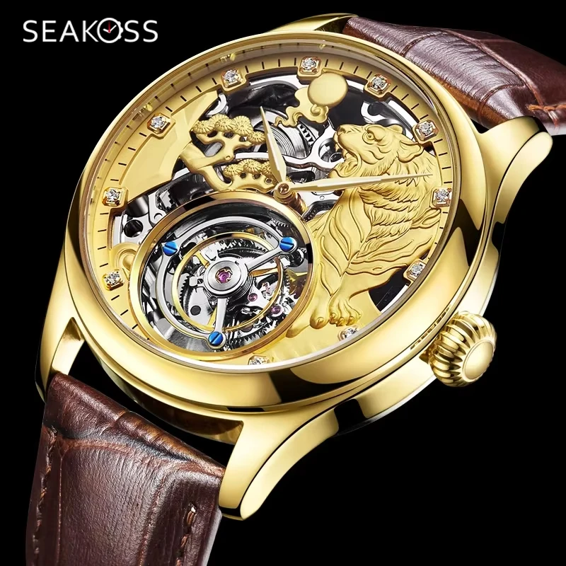 SEAKOSS Zodiac Tiger Super Skeleton Real Tourbillon Watches Men Luxury Sapphire Men's Hand Wind Mechanical Watches Leather Clock