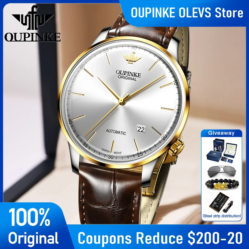 OUPINKE 3269 Mens Watch Automatic Swiss Movement Mechanical Watch 50M Waterproof Leather Strap Date Watches Luxury Box Gifts