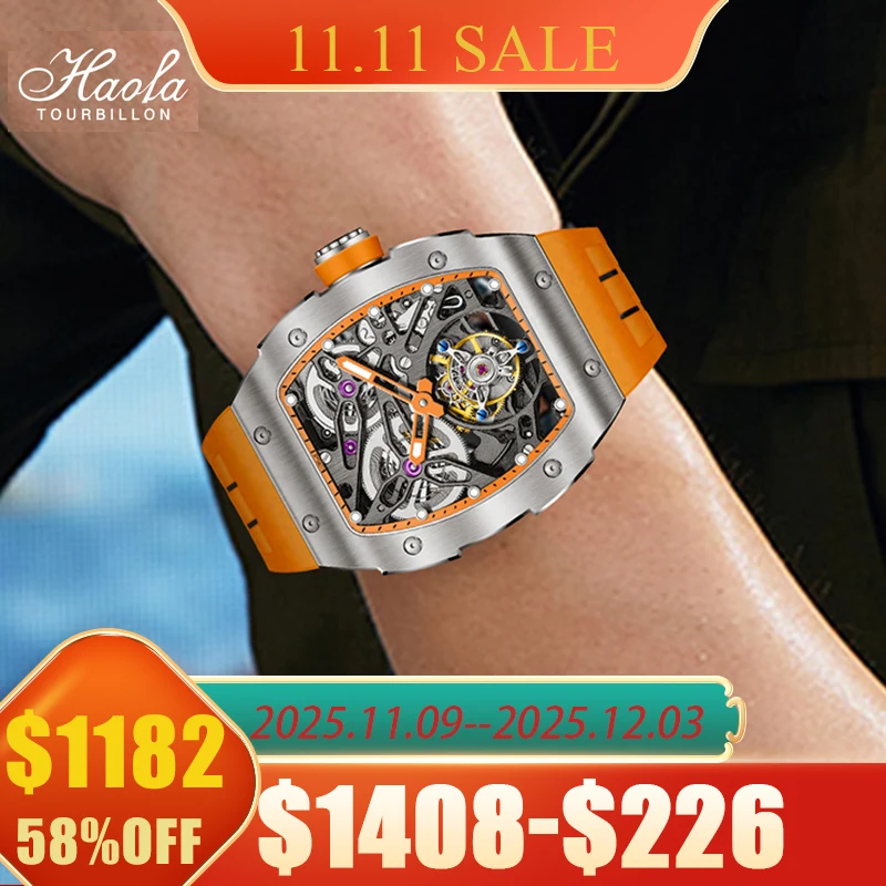 Haofa Tourbillon Watch Skeleton Automatic Movement Tonneau Sapphire Luminous Mechanical Wristwatch Men Double Spring Drive 1908
