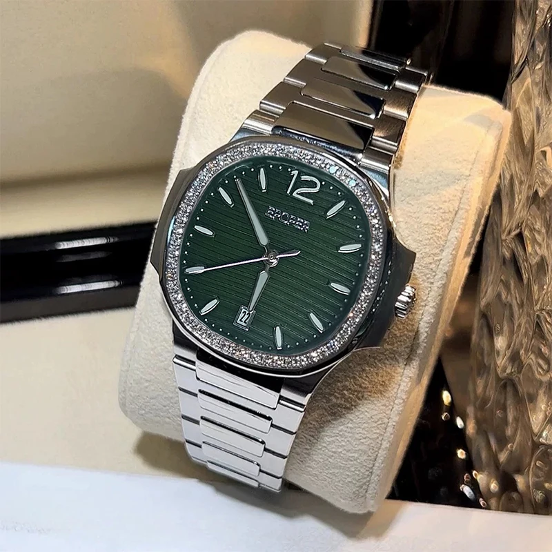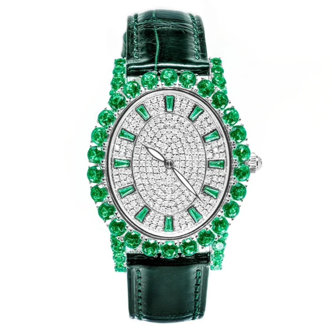 BELLUX Fashion Leather Strap Watch Style Luxury Full Diamond Green Gem Fine Jewelry Unisex Watch