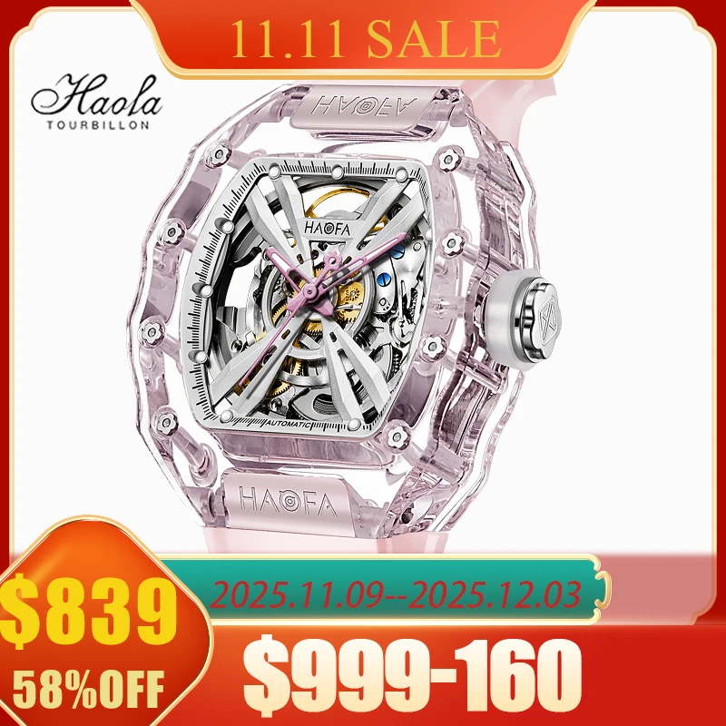 Haofa Luxury Automatic Mechanical Watches for Girl Transparent Crystal Wristwatch Hollowing Waterproof Luminous Women Watch 2302