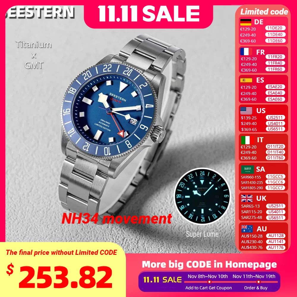 SEESTERN Titanium Diver Men of Watch GMT Automatic Mechanical Wristwatch NH34 Movement Sapphire Crystal 200M Waterproof Lume New