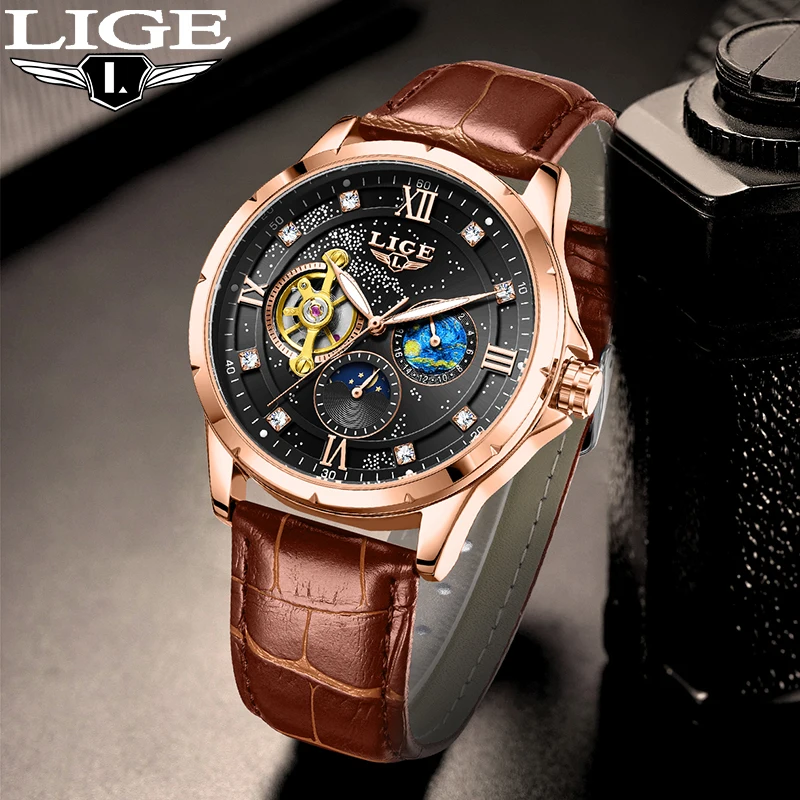LIGE Fashion Luxury Mechanical Watch Business Hollow Casual Sport Moon Phase Leather Waterproof Automatic Movement Men's Watches