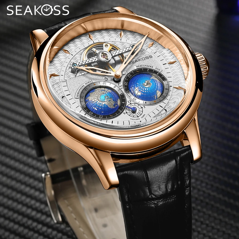 SEAKOSS Luxury Double Earth Rotating Men's Mechanical Watch Automatic Movement Waterproof Clock Pilots Men 1963 Flywheel Watches
